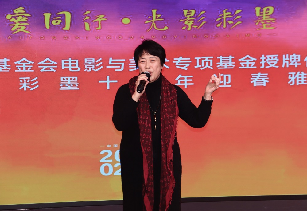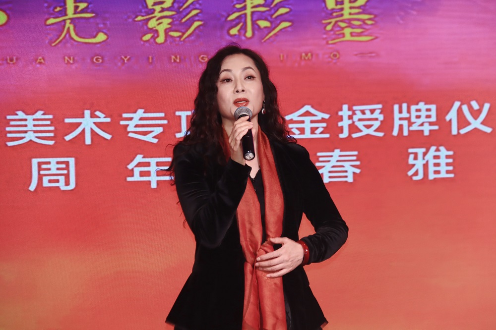随后,专项基金的捐赠方甘肃印象文化传媒有限公司董事长吴媚女士上台致辞,介绍专项基金的筹备情况与电影与美术跨界融合的美好愿景。吴媚董事长感谢中国文联、中国电影家协会的悉心指导以及中国电影基金会张丕民理事长及各位领导、艺术家和前辈的鼎力支持,阐述了设立基金的初心是以艺术为桥、电影为媒,打通电影与美术跨界壁垒,以公益为根,聚焦自闭症儿童帮扶等公益活动。