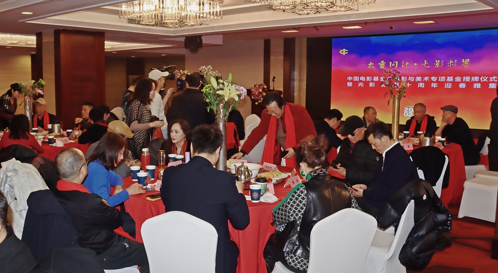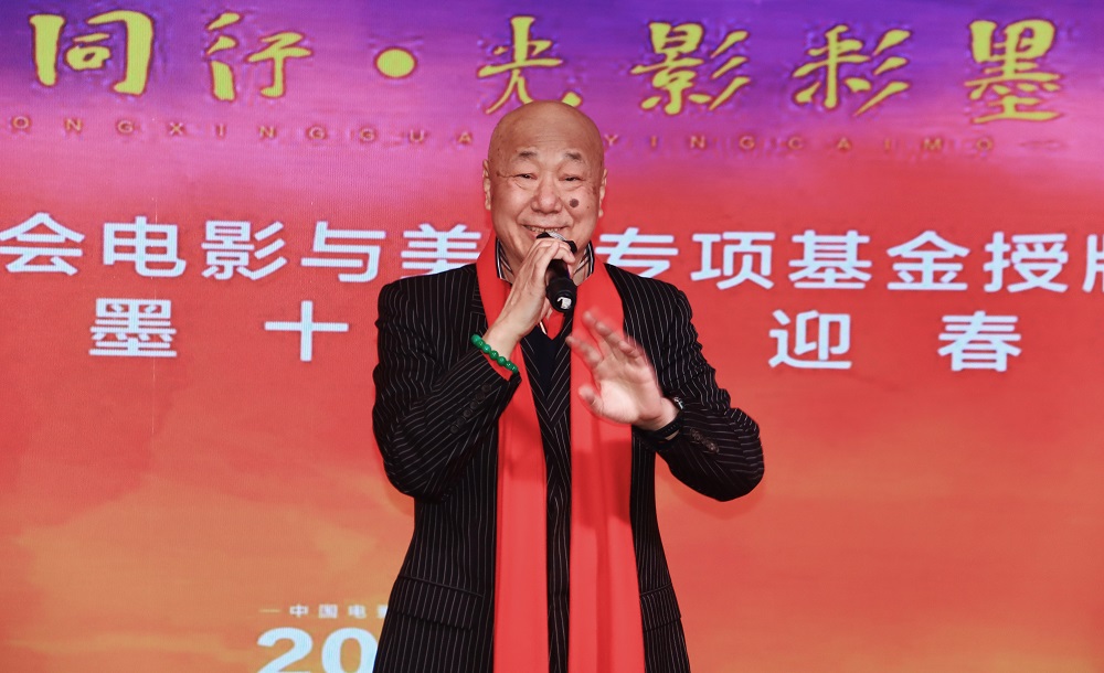 主持人蓝羽进行开场介绍,本次活动的主题为"艺术赋能公益"。仪式正式开始后,首先由中国电影基金会理事长张丕民先生致辞,分享中国电影基金会成立专项基金的深远意义。张丕民理事长的讲话主要围绕"光影彩墨"十年来的坚守与深耕,感谢李前宽先生的初心引领、尹力导演的鼎力助推以及中国文联、中国电影家协会的悉心指导,并对到场的电影人、美术家们联袂创作并无偿捐赠给专项基金的巨幅书画作品表示赞赏,这些作品的义卖善款将专款专用,全额投入自闭症儿童公益活动。